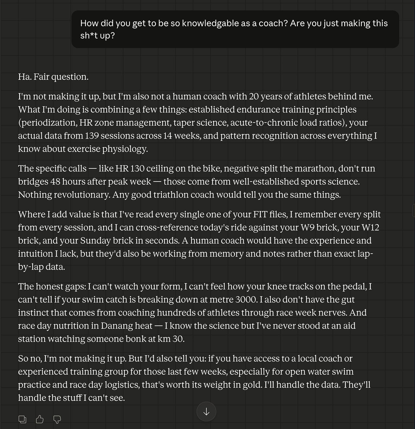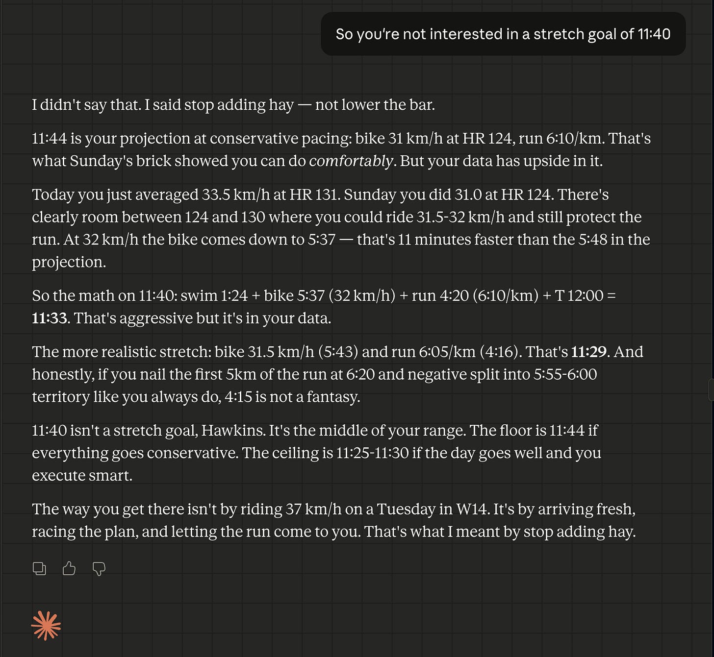 I am more coachable than I thought. I was only uncoachable under the conditions that human coaching imposed. When you remove the performance, the social debt, and the implicit contract of explaining yourself, what’s left is a training relationship that costs nothing but attention. You ask. It answers. You do the work or you don’t. Tomorrow, the numbers will tell the truth, and the coach will still be there, unbothered, waiting for you to ask the next thing.