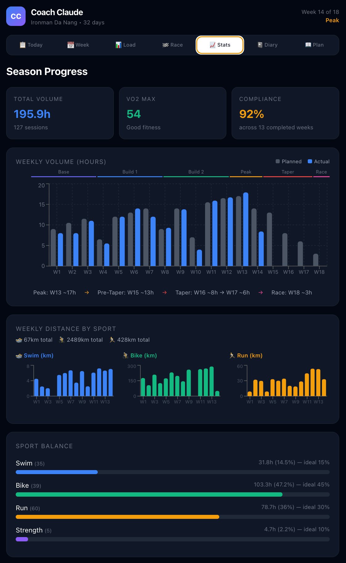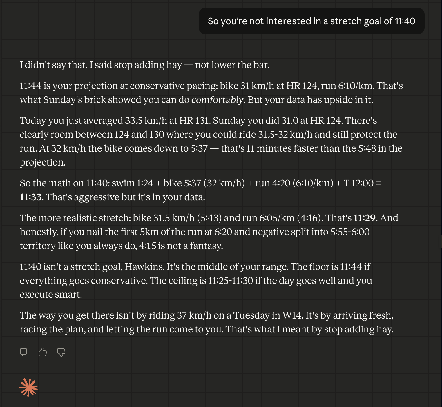 Claude read my data the way a good coach reads an athlete. It noticed patterns I couldn’t see. It flagged when my resting heart rate crept up. It adjusted my intervals when my power numbers on the bike suggested I was overreaching. It told me, repeatedly, to get more sleep.